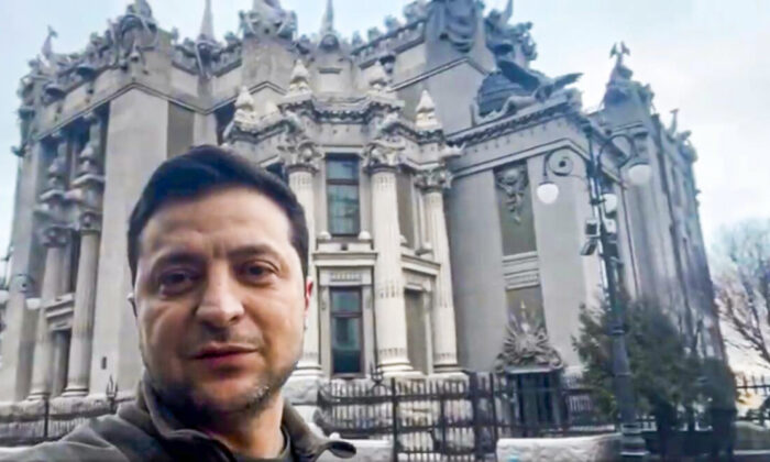 In this photo provided by the Ukrainian Presidential Press Office, Ukrainian President Volodymyr Zelenskyy speaks to the nation via his smartphone in the center of Kyiv, Ukraine, Saturday, Feb. 26, 2022. Russian troops stormed toward Ukraine’s capital Saturday, and street fighting broke out as city officials urged residents to take shelter. The country’s president refused an American offer to evacuate, insisting that he would stay. “The fight is here,” he said. (Ukrainian Presidential Press Office via AP)