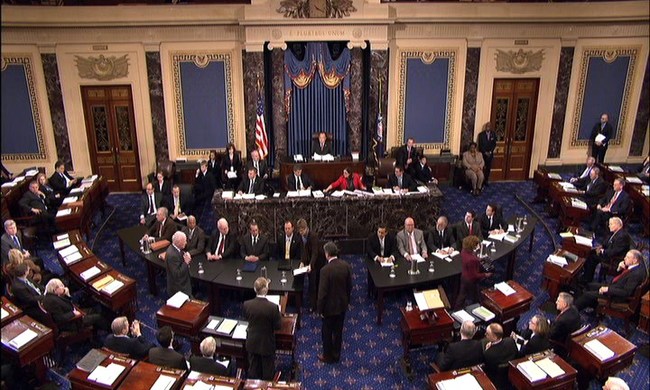 This video frame grab image provided by Senate Television shows the Senate impeachment trial of Judge G. Thomas Porteous, seated, table at right, facing camera, second from left. The attorney Porteous, facing a rare impeachment trial before the Senate argued Tuesday that Congress would be breaking with precedent by considering many of the charges against him. (AP Photo/Senate Television)