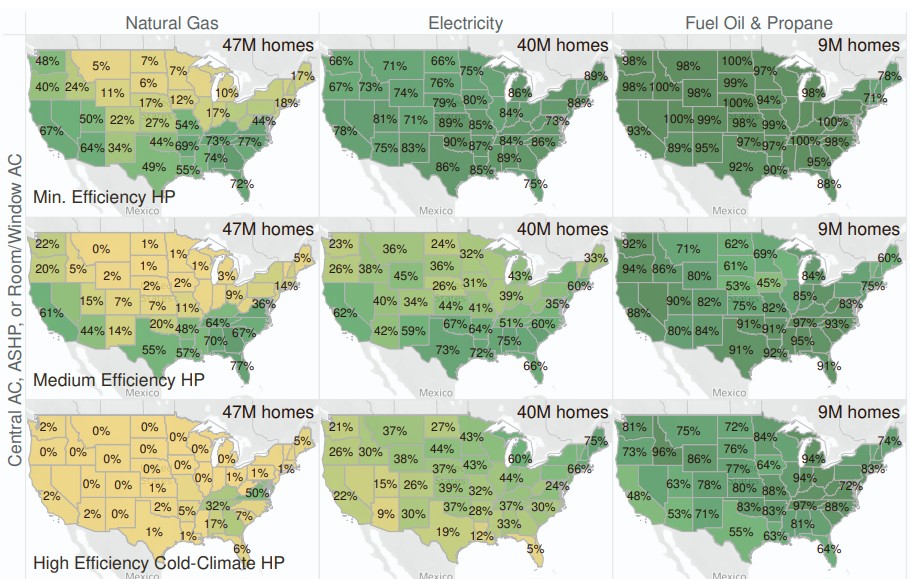 % of homes by state that will see a positive cash flow from switching to a heat pump from natural gas, electricity, or fuel oil/propane. Source: Wilson, Eric J.H. et al. Heat pumps for all? Distributions of the costs and benefits of residential air-source heat pumps in the United States. Joule, Volume 8, Issue 4, 1000 – 1035.