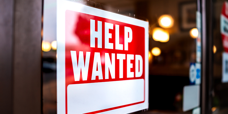 Sign text closeup for help wanted with red and white colors by entrance to store shop business building during corona virus covid 19 pandemic
